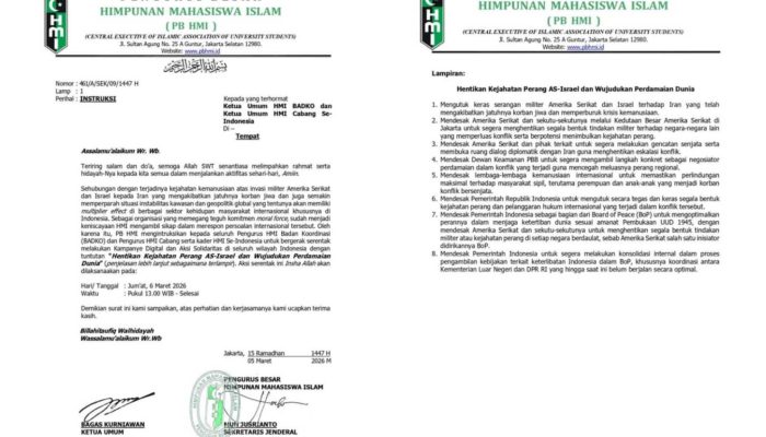 Instruksi tersebut tertuang dalam surat bernomor 461/A/SEK/09/1447 H yang diterbitkan oleh PB HMI di Jakarta pada 5 Maret 2026. Dalam surat tersebut, PB HMI mengajak seluruh kader HMI di Indonesia untuk bergerak secara serentak menyuarakan penghentian konflik bersenjata yang dinilai telah menimbulkan korban jiwa serta memperburuk situasi geopolitik global.
