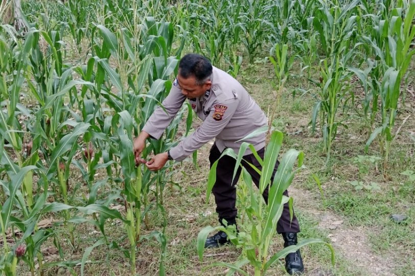 Dalam kegiatan tersebut, AIPTU Rusmiyadi melakukan pengecekan kondisi tanaman jagung guna memastikan pertumbuhan tanaman berjalan dengan baik serta memantau perkembangan lahan yang dikelola bersama kelompok tani binaan.