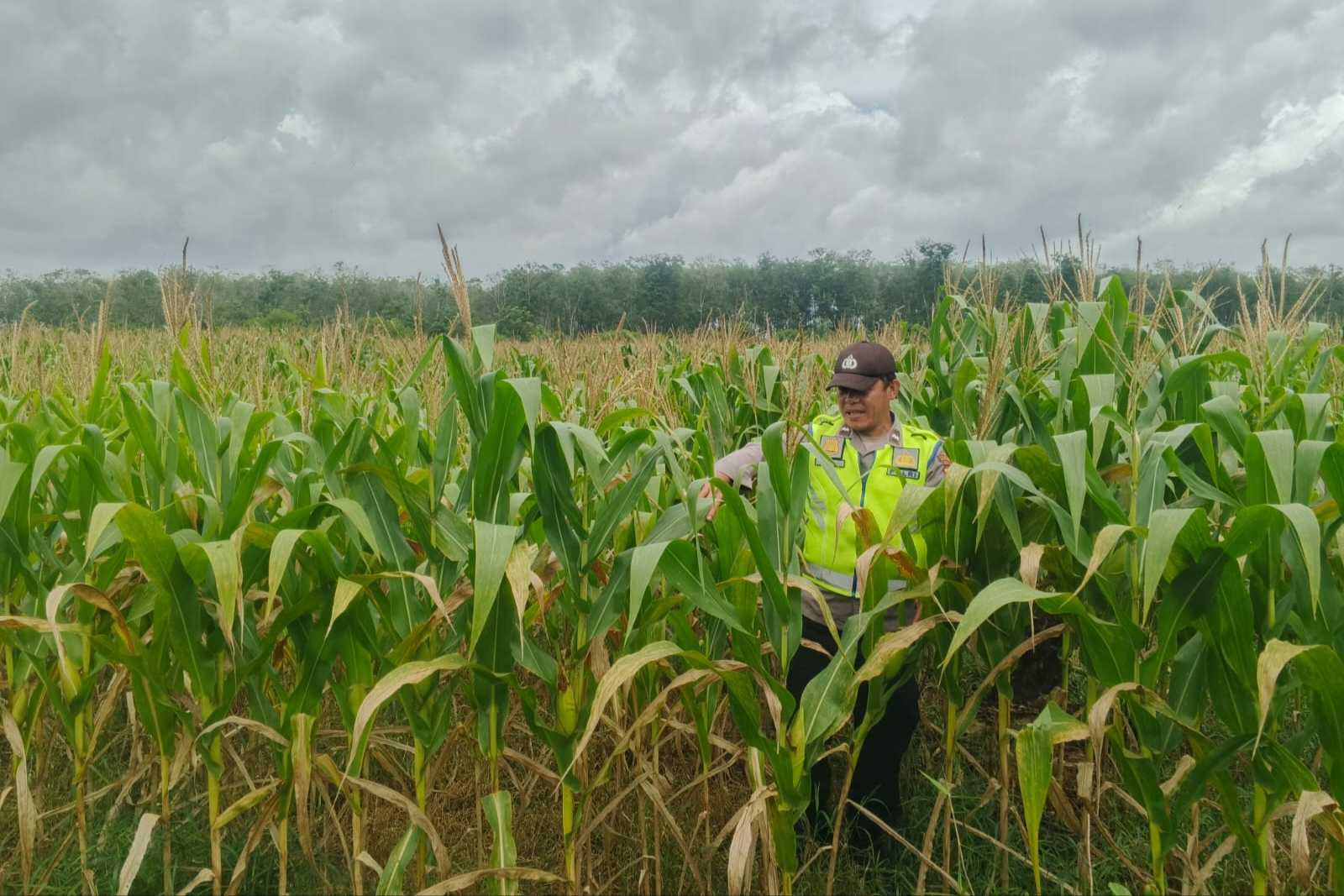 Dalam kegiatan tersebut, AIPDA Khairil Fikri melakukan pengecekan langsung terhadap kondisi tanaman sekaligus memberikan motivasi kepada petani agar terus memanfaatkan lahan yang ada secara optimal.