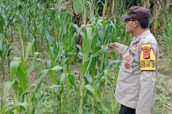 Anggota Bhabinkamtibmas Polsek BP Peliung, AIPDA Haryadi, turun langsung ke lokasi untuk melakukan pengecekan dan kontrol terhadap pertumbuhan tanaman jagung di lahan seluas kurang lebih satu hektare yang merupakan hasil pemanfaatan lahan kosong milik kelompok tani binaan.