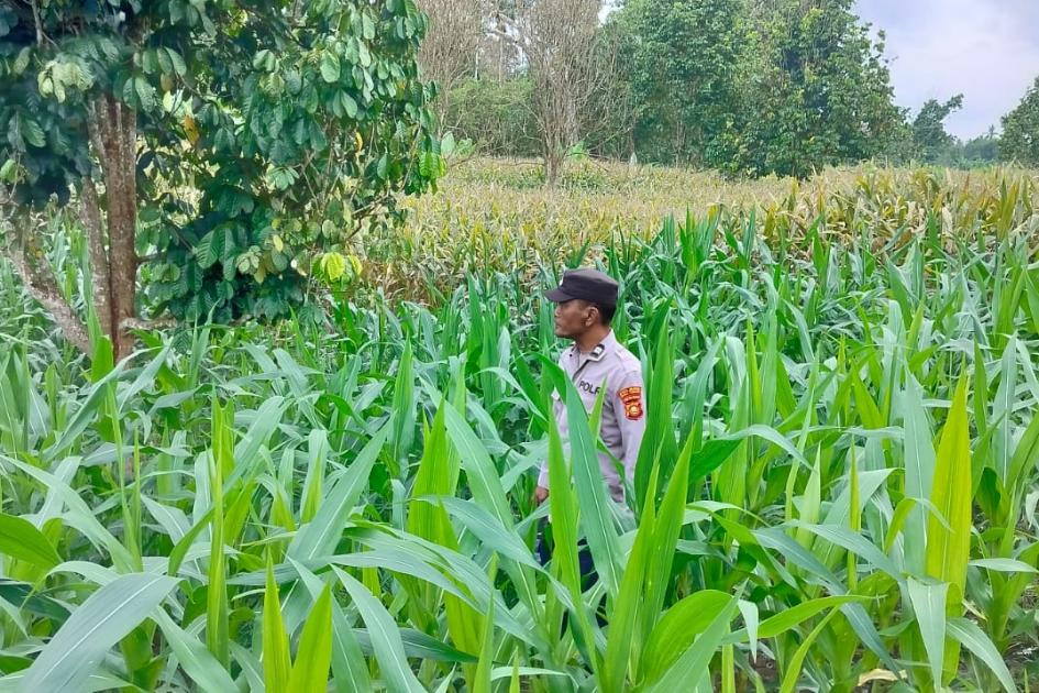 Kanit Patroli Polsek BP Peliung, AIPTU Bambang, turun langsung ke lokasi untuk melakukan pengecekan dan kontrol terhadap pertumbuhan tanaman jagung di lahan seluas kurang lebih satu hektare yang merupakan hasil pemanfaatan lahan kosong milik kelompok tani binaan.