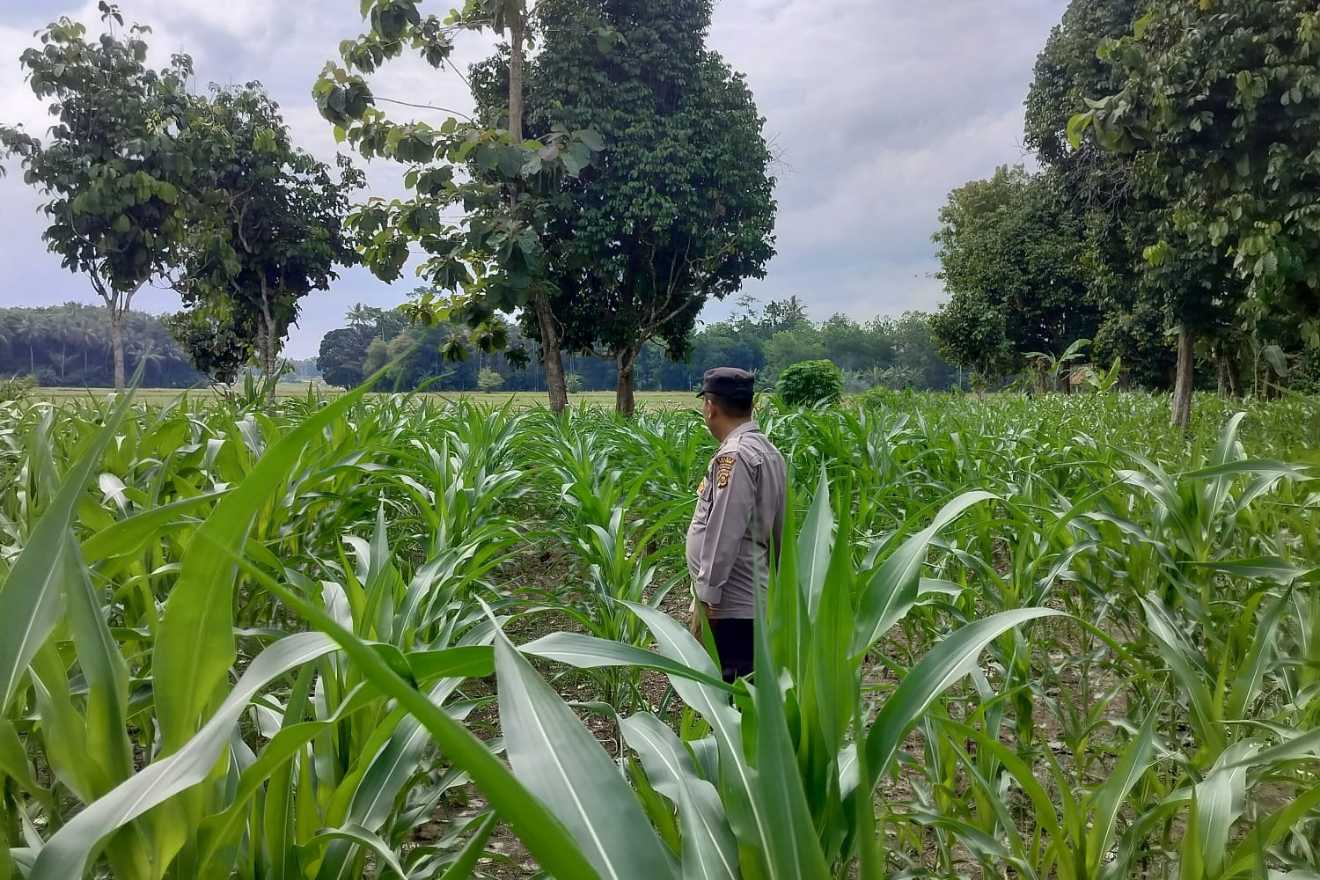 AIPDA Dedy Darmanto menjelaskan bahwa kegiatan ini bertujuan untuk memantau secara langsung perkembangan tanaman jagung sekaligus memastikan pengelolaan lahan berjalan dengan baik.
