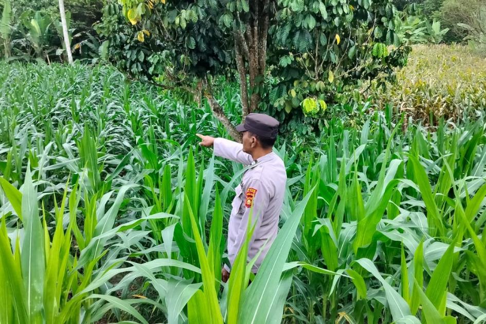 Dalam pelaksanaannya, Aiptu Bambang Kurniawan melakukan monitoring langsung terhadap kondisi tanaman guna memastikan pertumbuhan jagung berjalan optimal.