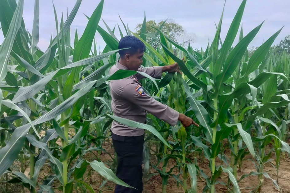 Dalam kegiatan tersebut, Aipda Faryadin melakukan kontrol langsung terhadap kondisi tanaman jagung guna memastikan pertumbuhannya berjalan optimal serta memberikan motivasi kepada masyarakat.