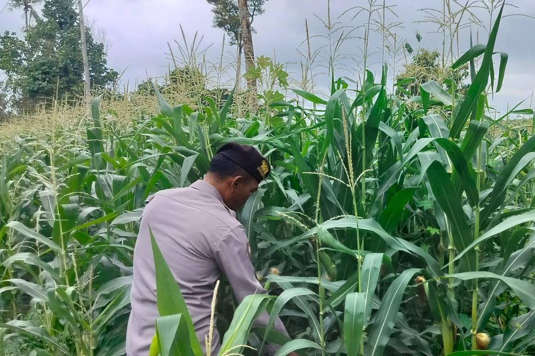 Di sela kegiatan, AIPTU Bambang menyampaikan bahwa pengecekan rutin dilakukan untuk memastikan kondisi tanaman jagung tetap terjaga dan berkembang secara optimal.